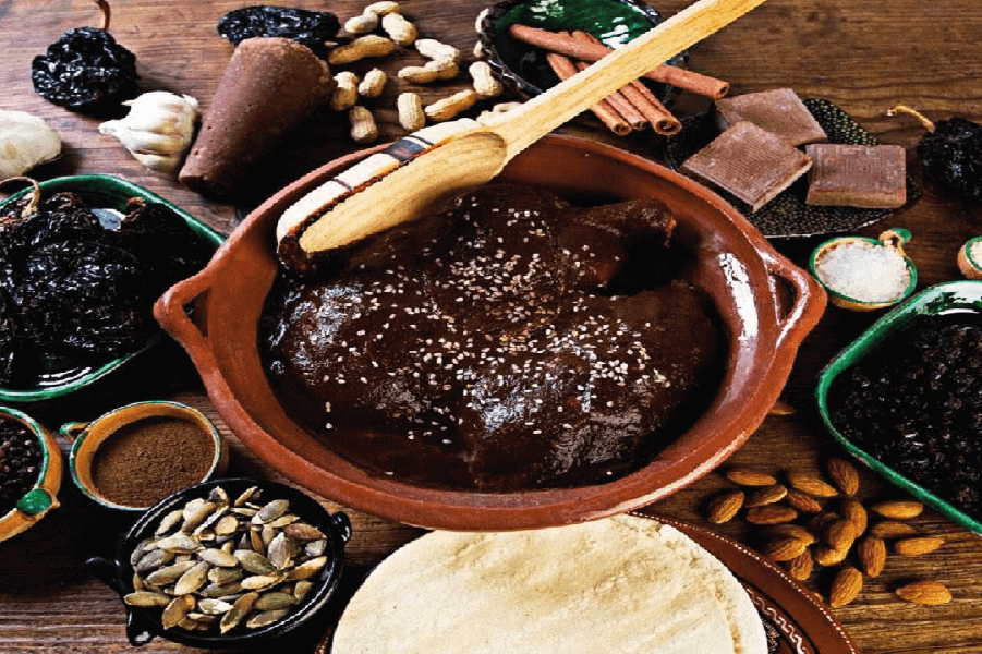 In this part of Mexico, any stew made with a combination of ingredients ground together is called a mole, but the most famous of all is mole poblano. The classic version is served with turkey, and uses four different kinds of chiles and a variety of ground seeds and nuts, including almonds, peanuts, and sesame seeds, plus its characteristic ingredient, dark bitter chocolate.