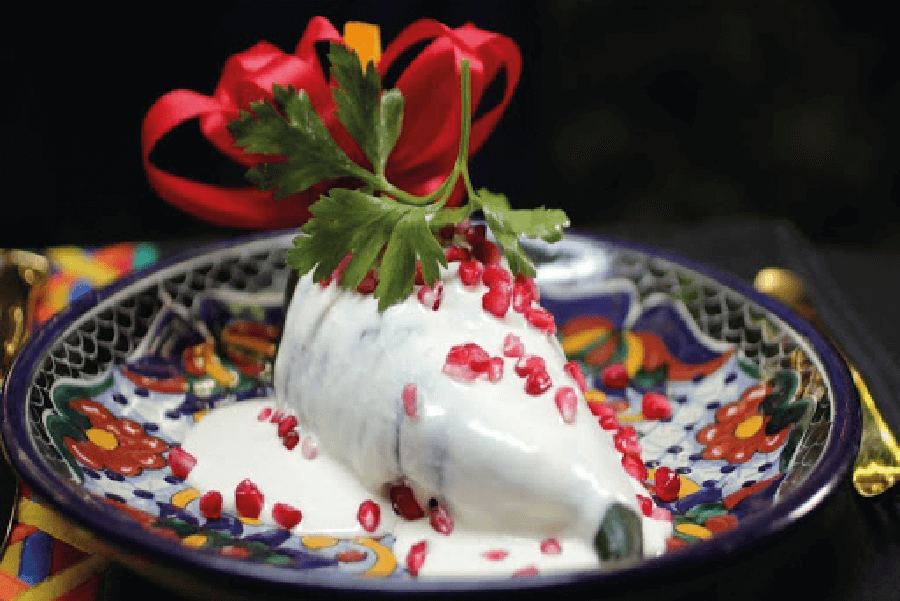 This dish is a tribute to the fruit of Puebla's late summer-early fall harvest season. Ground meat is seasoned and combined with raisins, pine nuts and local fruit: apples from Zacatlán, peaches and pears from Huejotzingo. Roasted poblano chiles from San Martin are stuffed with the mixture, batter-dipped, fried and topped with a creamy sauce made with walnuts from Calpan and garnished with pomegranates from Tehuacán.